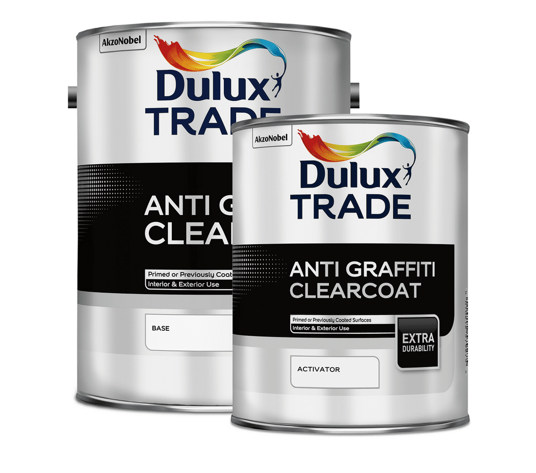 A two pack, water-based coating for use on interior and exterior surfaces. It can be used over existing sound coatings or clean, dry and laitance free uncoated masonry surfaces. Dulux Trade Anti-Graffiti Clearcoat dries to a tough gloss finish that has good impact & abrasive properties, protecting areas that are prone to graffiti.